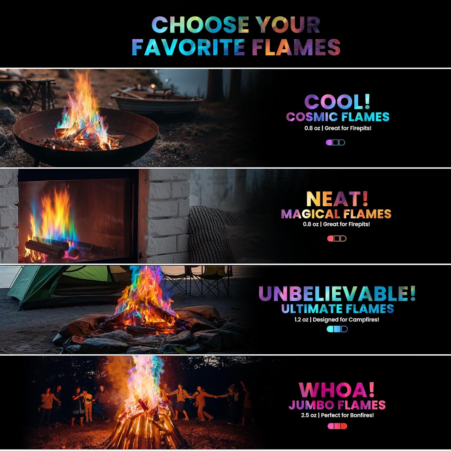 Enchanting Fire Show: Take your fire pit from 'Meh' to 'Marvelous' in seconds with our rainbow fire packets. Use 1–3 of these magic fire colorful flames packets for instant color-changing fire that turns any bonfire or campfire into a visual spectacle.